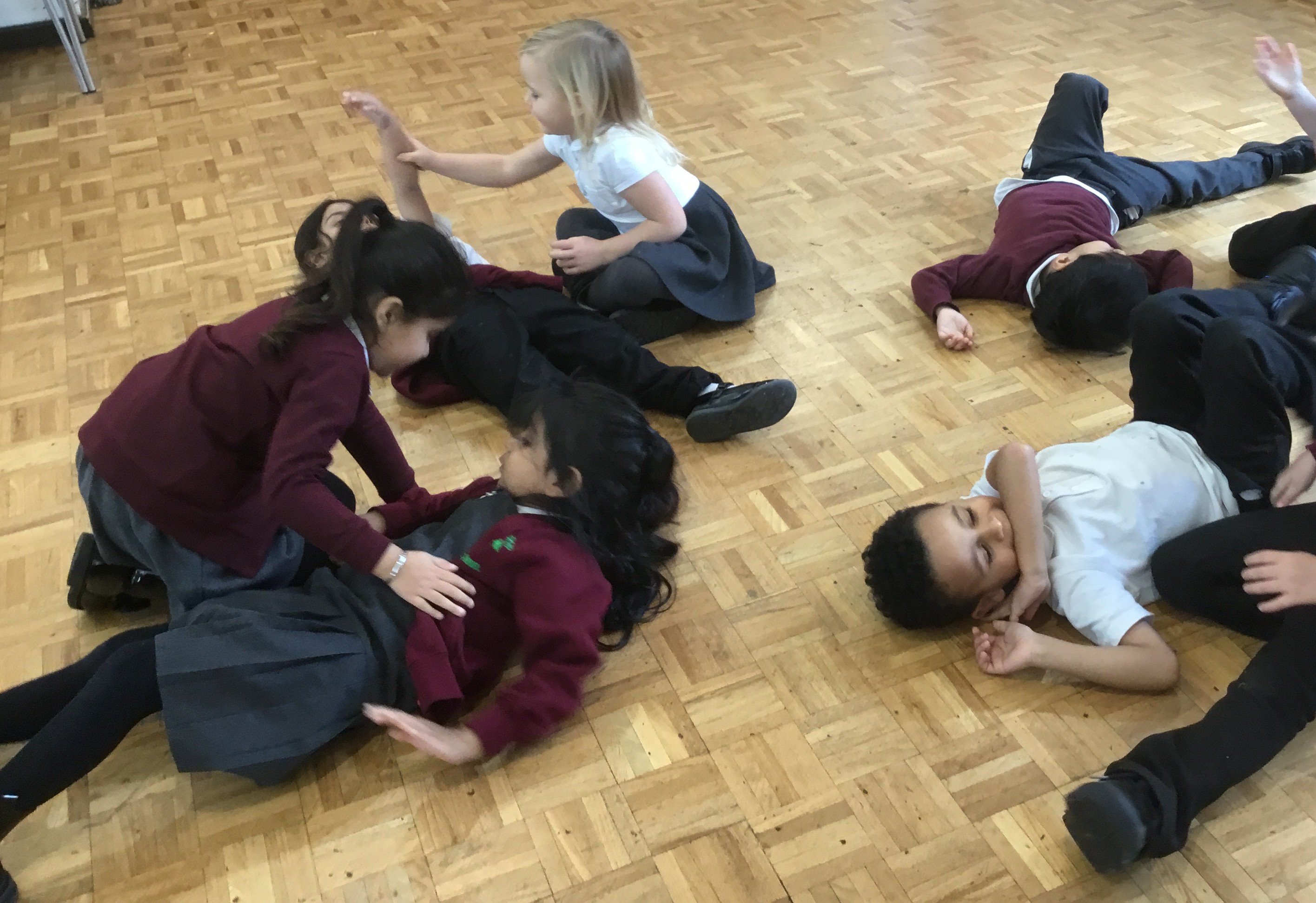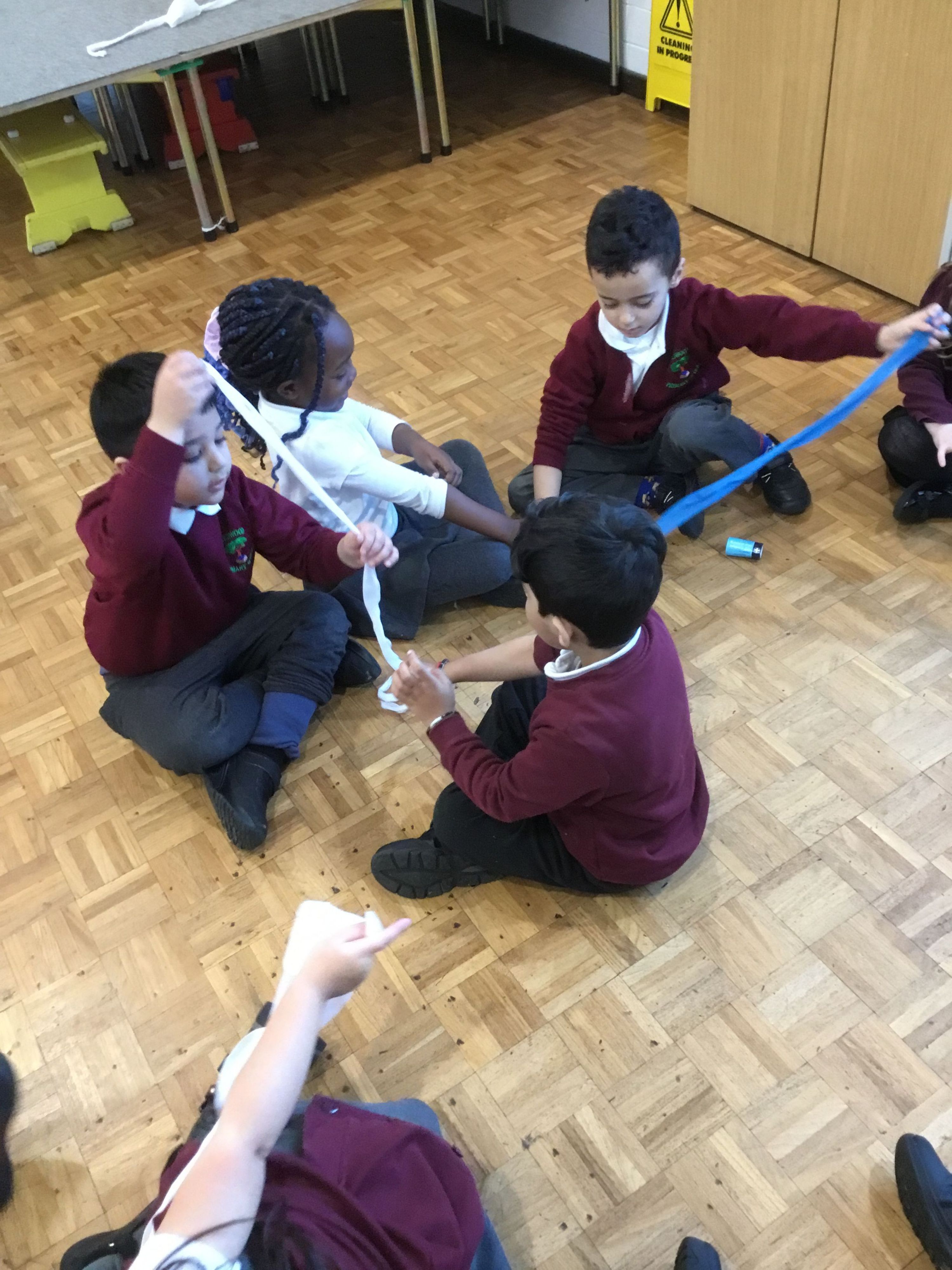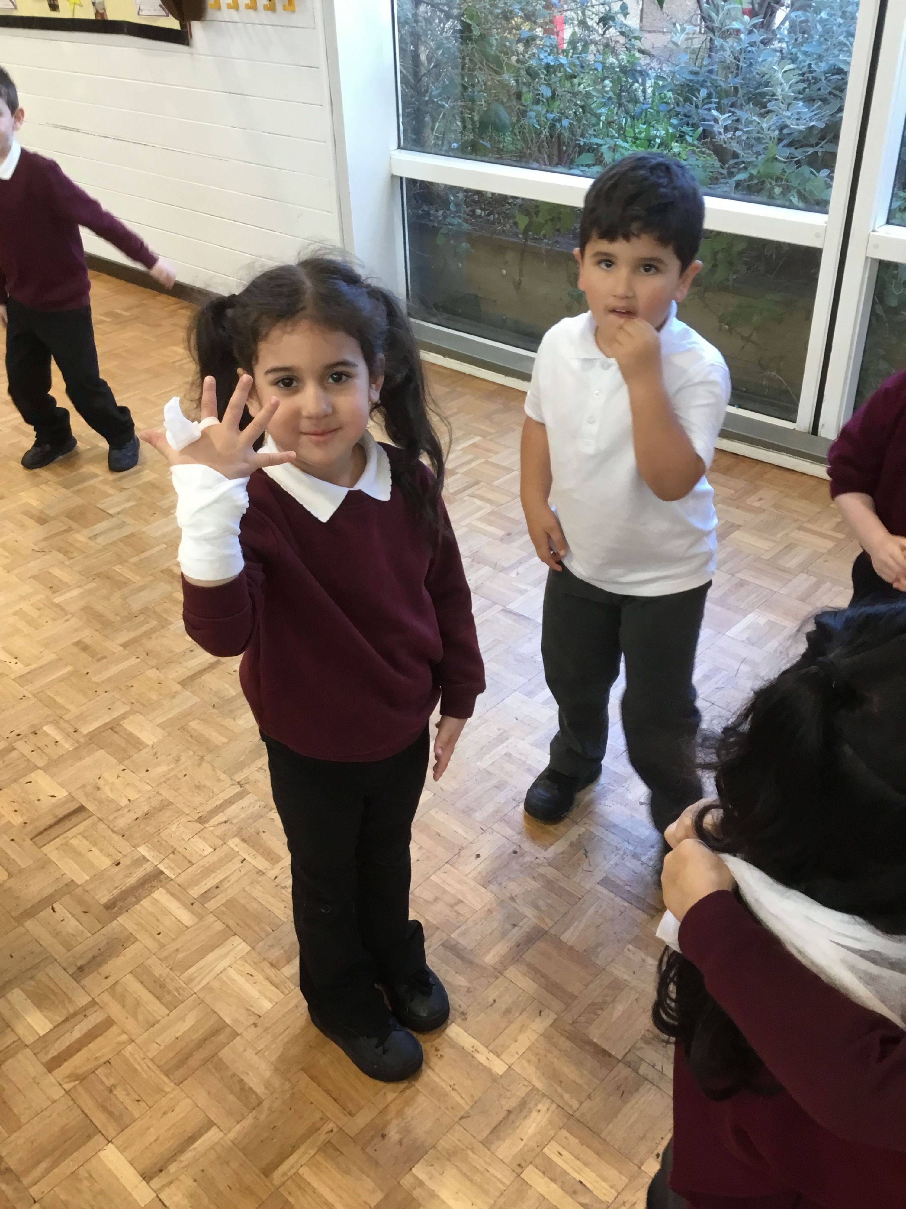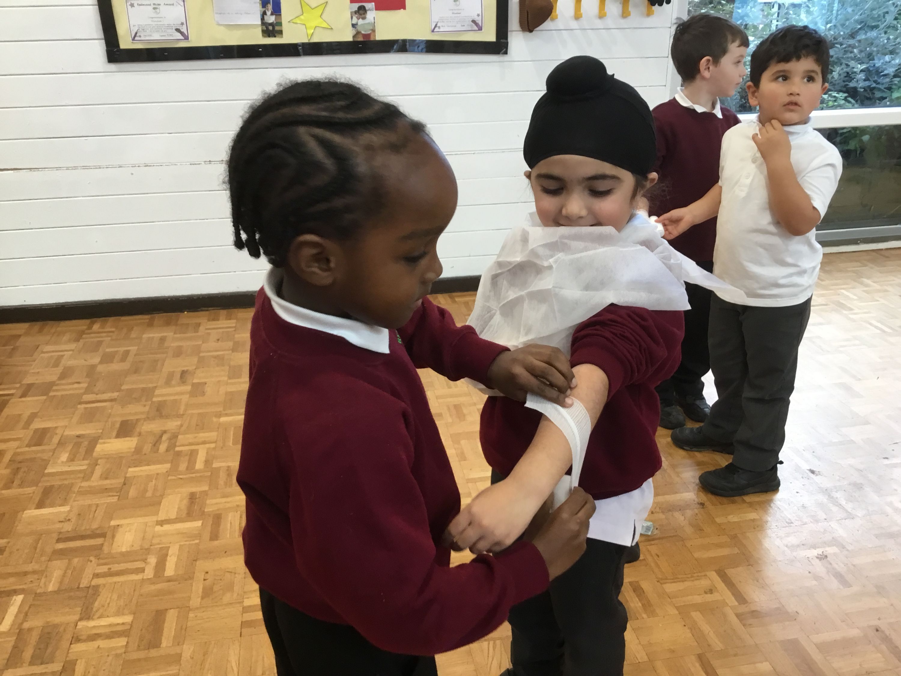 Learning First Aid with Sister Sarah. Applying bandages and slings.